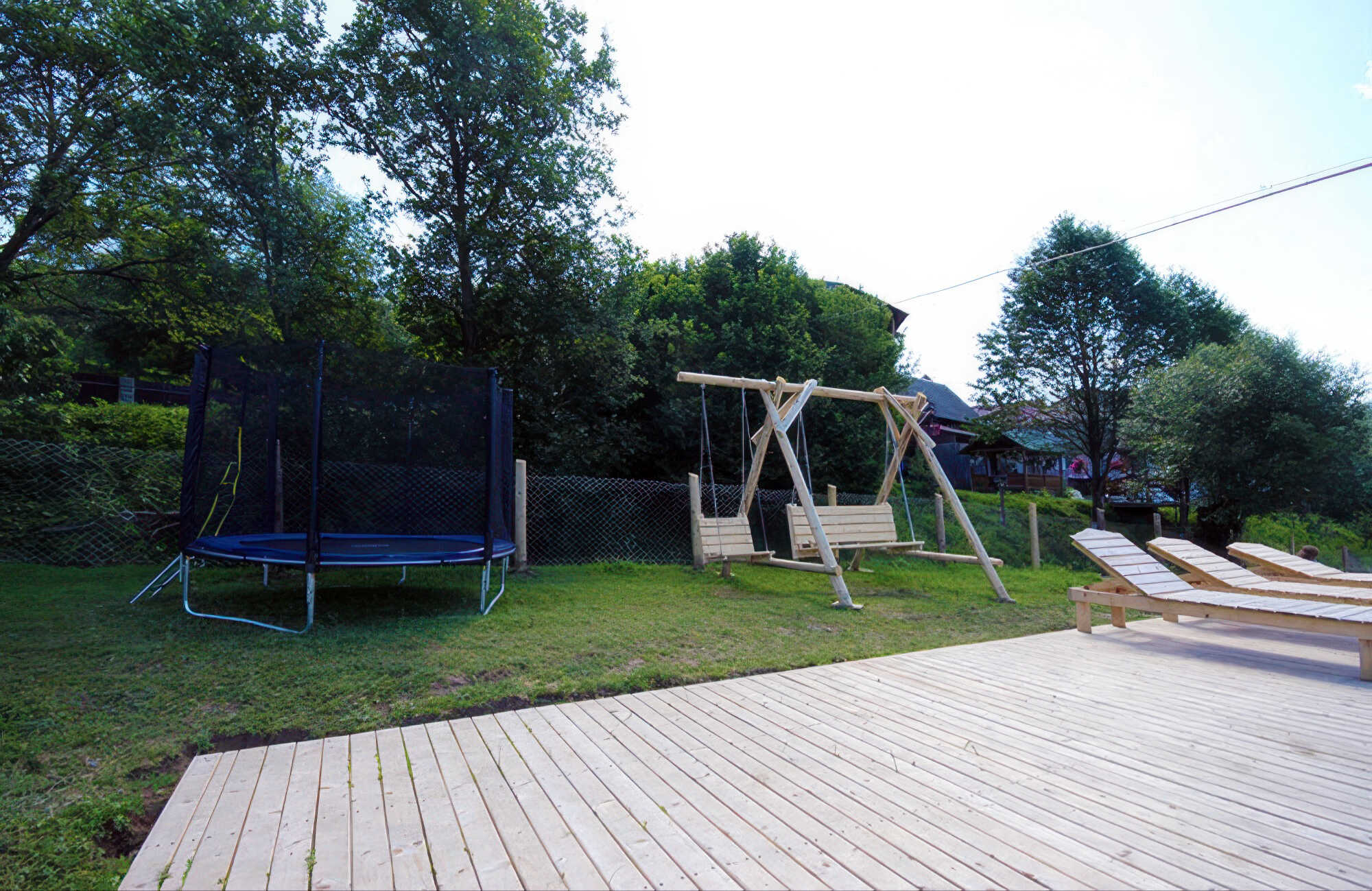 На подвір'ї є альтанка, мангал, гойдалка, батут, відкритий басейн.